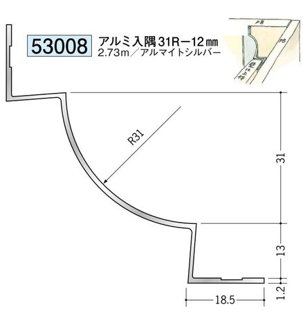 アルミ製入隅ジョイナー アルミ入隅31R-12mm アルマイトシルバー 長さ2.73m