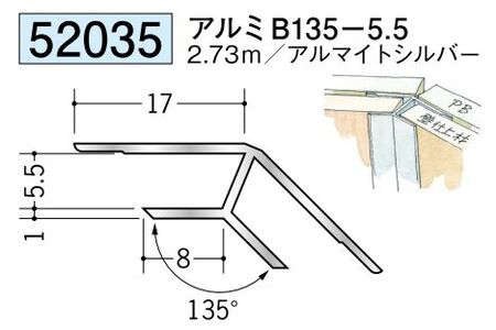 アルミ製角度付きジョイナー入隅 アルミB135-5.5 アルマイトシルバー 長さ2.73m