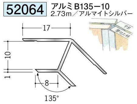 アルミ製角度付きジョイナー入隅 アルミB135-10 アルマイトシルバー 長さ2.73m