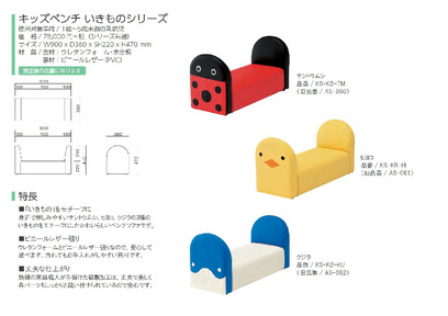 【キッズ専用ベンチ生き物シリーズ】子供が大好きな遊べるベンチ生き物シリーズ。3種類の仲間がそろいました。お手入れしやすいビニールレザー製。