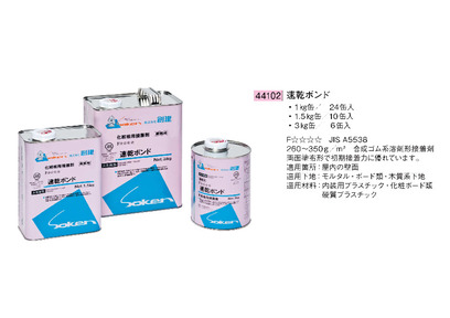 F☆☆☆☆ JIS A5338 合成ゴム系溶剤型接着剤・サイズ:1kg缶・1.5kg缶・3kg缶 適用箇所:庫内の壁面 適用下地:モルタル・ボード類・木質系下地 適用材料:内装用プラスチック・化粧ボード類・硬質プラスチック