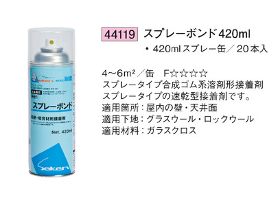 F☆☆☆☆ 4~6㎡ ・スプレータイプ合成ゴム系溶剤接着剤4~6㎡/缶・適用箇所:屋内の壁・天井面・適用下地:グラスウール・ロックウール・適用材料:ガラスクロス