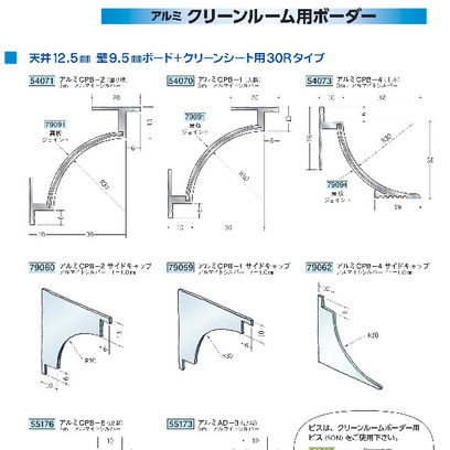 アルミ製クリーンルーム用ボーダー(天井12.5mmm壁9.5mmボード+クリーンシート用30Rタイプ) CPB(廻り縁・入隅・巾木・出隅・サイドキャップ) アルマイトシルバー