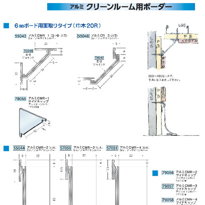 アルミ製クリーンルーム用ボーダー(6mmボード用面取りタイプ巾木20R) CMR(廻り縁・入隅・巾木・出隅・サイドキャップ)アルマイトシルバー