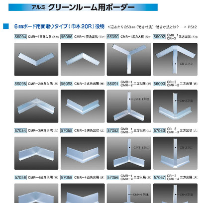 アルミ製クリーンルーム用ボーダー(6mmボード用面取りタイプ巾木20R) CMR役物(直角出入隅・三方出入隅)アルマイトシルバー