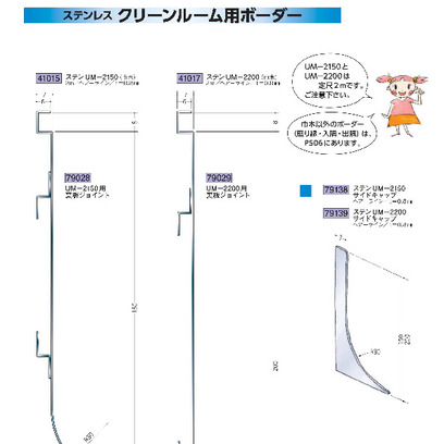 ステンレス製クリーンルーム用ボーダー ステンUM-2150/2200(巾木)・サイドキャップ ヘアーライン