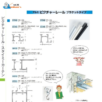 アルミ製ピクチャーレール(ブラケットタイプ) PR-409/412/615S/33F アルマイトシルバー ・ホワイトアルマイト3・電解ブラック 長さ3m