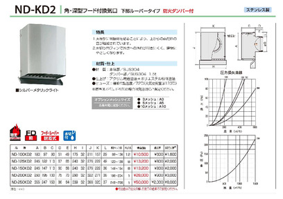 角・深型フード付 100φ~250φ 網付(5メッシュ)FD付(72℃) ND-100KD2-A5~250KD2-A5 下部ルーバータイプ防火ダンパー付 シルバーメタリックライト 【取扱停止】
