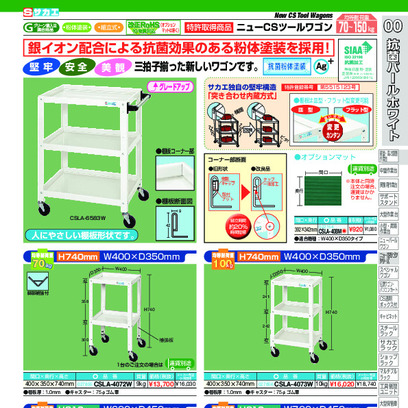 堅牢・安全・美観 三拍子揃った新しいワゴンです。 人にやさしい棚板形状です。