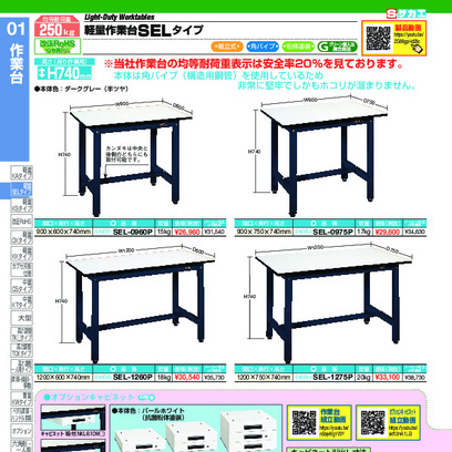 軽量作業台SELタイプ(均等耐荷重250kg) SEL-0960/0975/1260/1275/1560/1575/1860/1875/1890P 本体:ダークグレー 天板:ホワイト