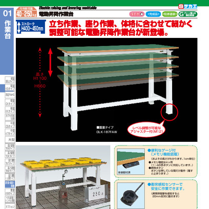 立ち作業、座り作業、体格に合わせて細かく調整可能な電動昇降作業台。