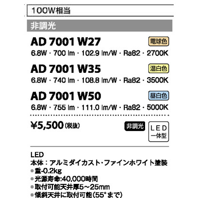 ダウンライトLED電球色6.8W(白熱球100W相当) 非調光 AD 7001W27 4台/ケース 【取扱停止】