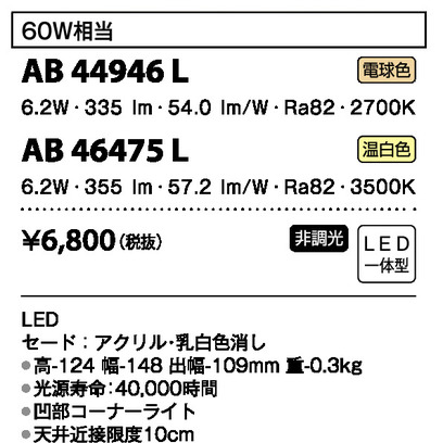 薄型シーリングライトLED電球色6.2W(白熱球60W) 非調光 AB 44946L 2台/ケース 【取扱停止】