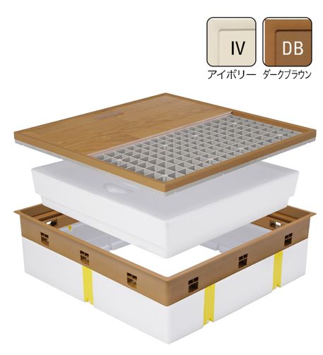 ●在来工法(木ねじ使用時)外枠受け樹脂を外枠下部にセットし、外枠を開口部にはめ込み、外枠受け樹脂を根太にビス止めします。置床工法(スピードクリッパー使用時)スピードクリッパーを外枠下部にセットし、外枠を開口部にはめ込み、スピードクリッパーを回転させて床面の下へ固定します。