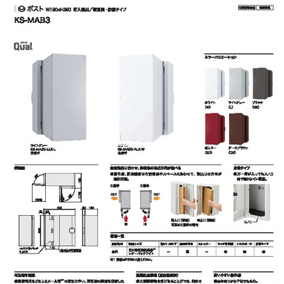 ポスト KS-MAB3-LLK(左勝手)/RLK(右勝手) W190×H390 前入横出/壁貫通・防滴タイプ W/L/BK/BD/DB
