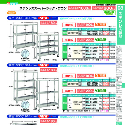 ●外寸:W1200×D450×H1314mm●本体色:シルバー●耐荷重:200kg●質量:28kg●キャスター:100φナイロンウレタン車、ストッパー付2個(スチール金具)●棚板サイズ:1200×450●段数:3段●材質:SUS304●改正RoHS10物質対応●付属品:直進安定金具JK-C×2個