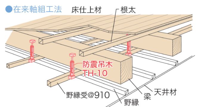 ●2階からの振動をカット!2階床から1階天井へ伝わる振動をカットする画期的な構造。在来軸組工法用と枠組壁工法用の2種類を用意しています。