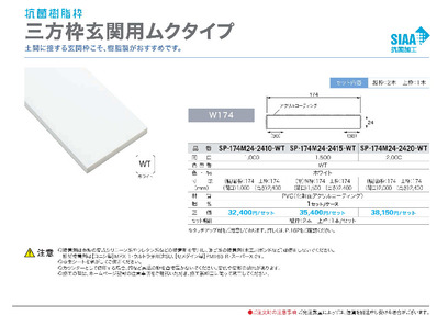 樹脂ドア枠 三方枠玄関用ムクタイプ 【幅174mm・開口2000mm・高さ2400mm】SP-174M24-2420-WT(セット内容:縦枠2本・上枠1本)