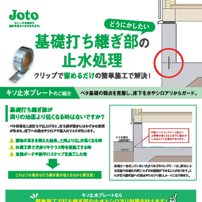 ベタ基礎のコンクリート打ち継ぎ箇所に鋼板製のプレートを埋め込むことで、「水」や「シロアリ」の侵入経路を塞ぎます。