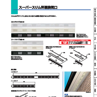 ●用途:軒天井に取付ける換気金物です。●表面処理:下地(カチオン電着塗装) 仕上(静電粉体焼付塗装) ●付属品:ステンレスカラー:ビス×6本 ●開口寸法:40×405mm●有効換気面積:87.5㎠