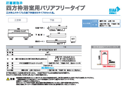 樹脂製 四方枠浴室用バリアフリータイプ【幅150mm・開口800mm・高さ2200mm】SP-R7507M24-WT