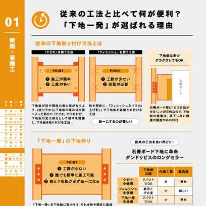 面倒だった壁や天井の下地取付が「下地一発」に下地板を取り付けるだけの簡単施工に!