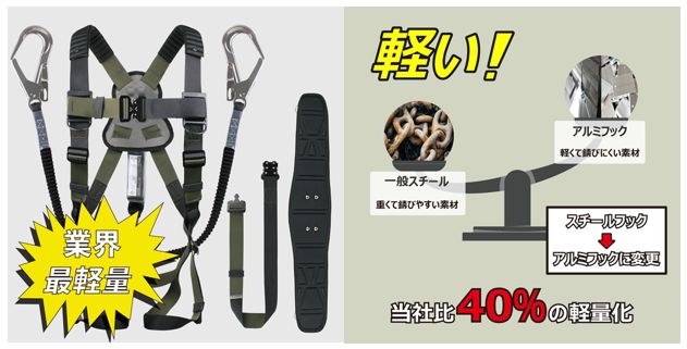 【商品内容】 フルハーネス、蛇腹ダブルランヤード(2丁掛け)、 胴ベルト、サポートベルト、肩ベルト、背中パッド