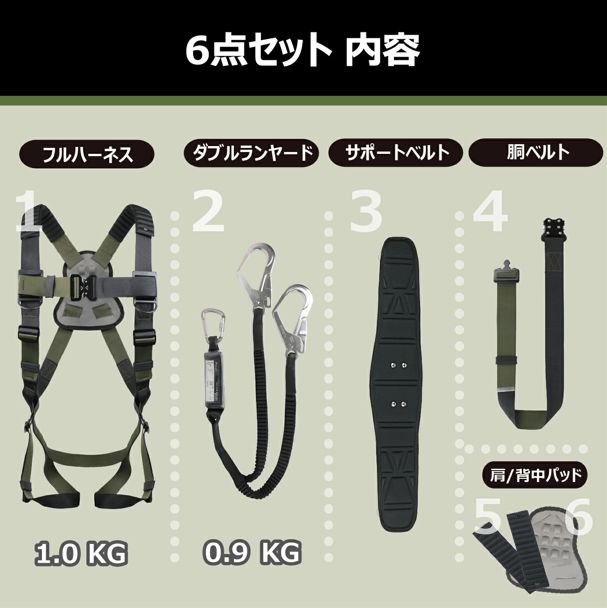 フルハーネス6点セットフリーサイズ《フルハーネス・ダブルランヤード・サポートベルト・胴ベルト・肩/背中パット》