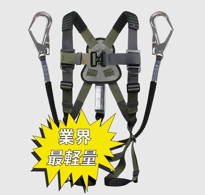 【商品内容】 フルハーネス、蛇腹ダブルランヤード(2丁掛け)、肩ベルト、背中パッド