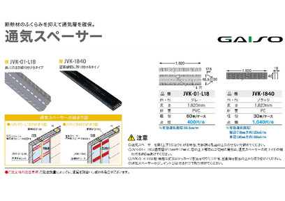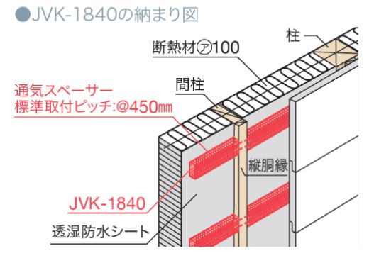 ・JVK-1840は、竪胴縁の間隔に合わせて設置するタイプ。竪胴縁施工に先立ち端部用の通気部材として最適です。