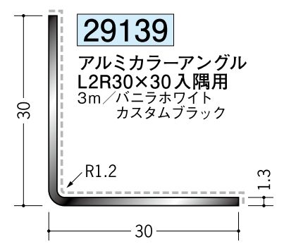 アルミ製R付アングル(等辺) アルミカラーアングルL2R30×30出隅用 バニラホワイト/カスタムブラック 長さ3m