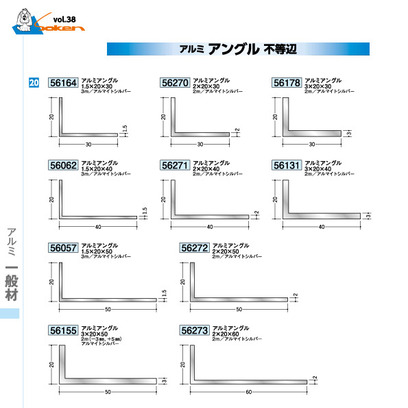 アルミ製アングル(不等辺) アルミアングル2×20×40 アルマイトシルバー 長さ2m