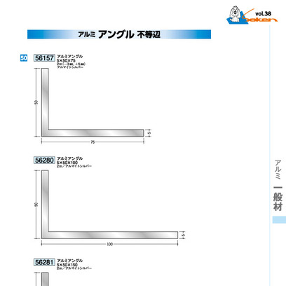 アルミ製アングル(不等辺) アルミアングル5×50×150 アルマイトシルバー 長さ2m 創建