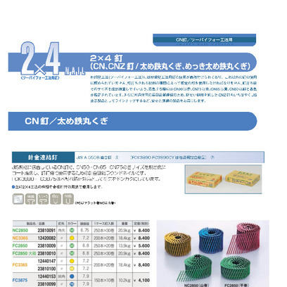 2×4用針金連結カラーCN釘 FC2850(CN50)/FC3365(CN65)/FC3875(CN75)/FCK3890(CN90)