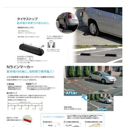 ●駐車場や車庫での接触事故を防止します。設置も簡単なタイヤストップ。●駐車場や車庫での接触事故を防止します。設置も簡単です。●環境に配慮し、再生ゴムを使用していますので割れや変形が少ない。車のボディーをキズ付けにくい。 ●・アンカーボルト(市販品)を使って固定することもできます。鉄のプレートがインサートされています。●【使用上の注意】○事故につながるおそれがありますので、駐車時には速度を落として停車してください。○本品は普通自動車の重量程度を対象にしていますので、運搬車輌での使用は避けてください。○軟弱な場所での使用は避け、平らな所に設置してください。○本品に破損や変形が起こった場合は、使用を中止してください。○本品設置には前後があります。FRONTと書かれた面をタイヤ接地面にしてください。