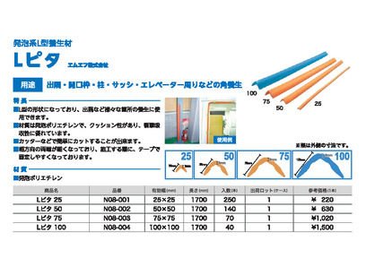 ●発泡系L型養生材●L型の形状になっており、出隅など様々な箇所の養生に使用できます。●材質は発泡ポリエチレンで、 クッション性があり、 衝撃吸収性に優れています。●カッターなどで簡単にカットすることが出来ます。●幅方向の両端が細くなっており、施工する際に、テープで固定しやすくなっております。