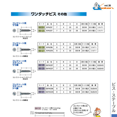 ワンタッチビス コンクリート用 ナベ頭 線径4.0mm×長さ25/32mm・線径5.0mm×長さ32mm