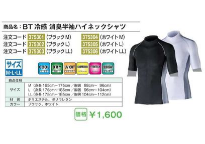 BT冷感 消臭半袖ハイネックシャツ ブラック・ホワイト 【取扱停止】