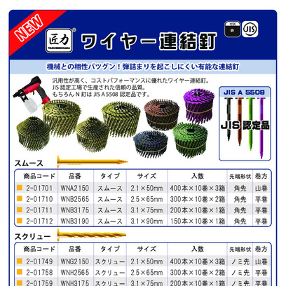 匠力 ワイヤー連結釘(山巻・平巻)スクリュー WNG2150~ 【取扱停止】