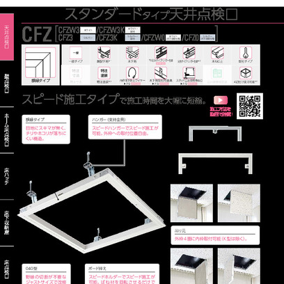 スピード施工タイプで施工時間を大幅に短縮。額縁タイプ:目地にスキマが無く、チリやホコリが落ちにくい構造。ハンガー(支持金具):スピードハンガーでスピード施工が可能。外枠への取付位置自由。040型:野緑の切断が不要なジャストサイズで改修工事に最適。ボード押え:スピードホルダーでスピード施工が可能。ばね材を回転させるだけで取付け完了