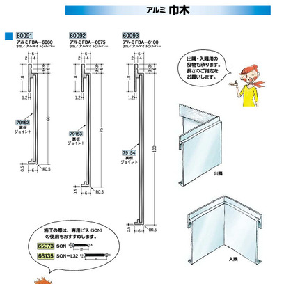 アルミ製巾木 アルミFBA-6060~6100 長さ3m/出隅/入隅 アルマイトシルバー