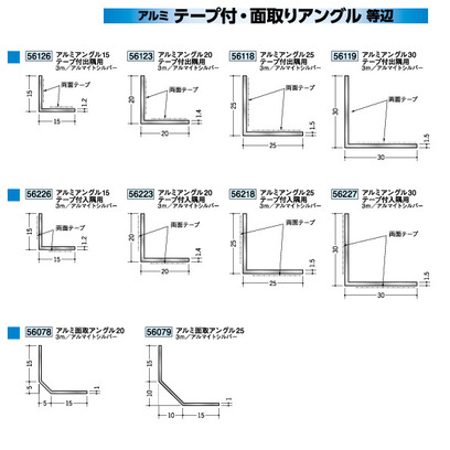 アルミ製テープ付アングル(等辺) アルミアングル15テープ付出隅用 15mm×15mm・20×20・25×25・30×30 アルマイトシルバー 長さ3m 創建