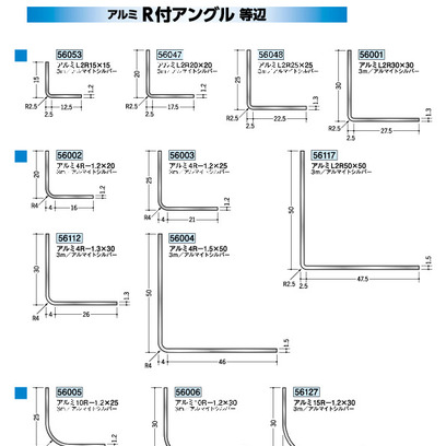 アルミ製R付アングル(等辺) アルミL2R15×15 アルマイトシルバー 長さ3m 創建