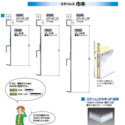 ステンレス製巾木(ヘアーライン) ステンUF 本体・直角出隅・直角入隅・ビス ヘアーライン 創建