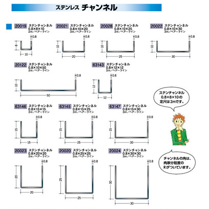 ステンレス製チャンネル ステンチャンネル0.8mm×8mm×10mm~1.5mm×10mm×30mm ヘアーライン 長さ2m 創建