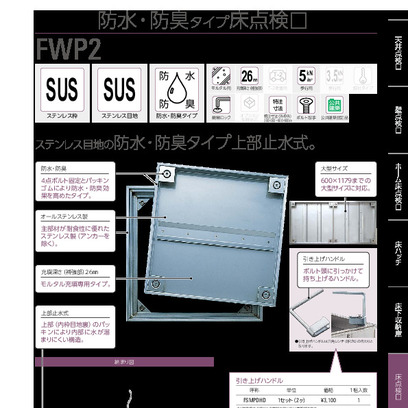 アンダーハッチ(ステンレス枠防水・防臭タイプ) FWP2型 450/600/750/900角・600×1179角 ハンドル付