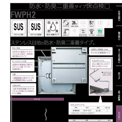 アンダーハッチ(ステンレス枠防水・防臭タイプ) FWPH2(2重蓋タイプ) 450/600/750/900角・600×1179角 ハンドル付【受注生産品】