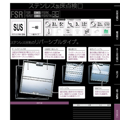●ステンレス目地のリバーシブルタイプ(樹脂タイル仕様・モルタ ル仕様になる兼用)●オールステンレス製●貼りしろ( タイル:樹脂3mm・モルタル26mm・2Tモルタル22.5mm)●車両通行可(FSR2T型)●施錠方向(錠付FSRK型)