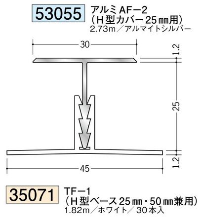 アルミ 断熱材用ジョイナー嵌合型 アルミAF-2(H型カバー25mm用/アルマイトシルバー長さ2.73m)・ TF-1(H型ベース25・50mm兼用/ホワイト長さ1.82m)価格: 820円 (税別) 〜
