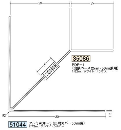 アルミ 断熱材用ジョイナー出隅 アルミADF-3(出隅カバー50mm用/アルマイトシルバー長さ2.73m)・PDF-1(H型ベース25・50mm兼用/ホワイト長さ1.82m)価格: 1,035円 (税別) 〜